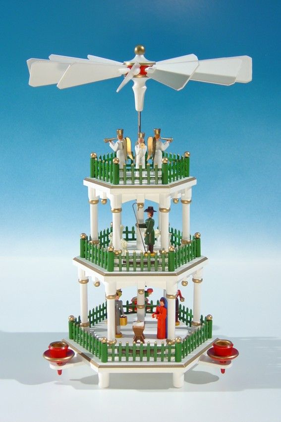 Höhe 35 cm, In den unteren 2 Etagen drehen sich die Figuren um die Mittelachse. Es wird die Weihnachtsgeschichte erzählt. Von oben blasen 3 Verkündigungsengel., Original erzgebirgische Handarbeit, vor Feuchtigkeit schützen, nur im Innenbereich verwenden.