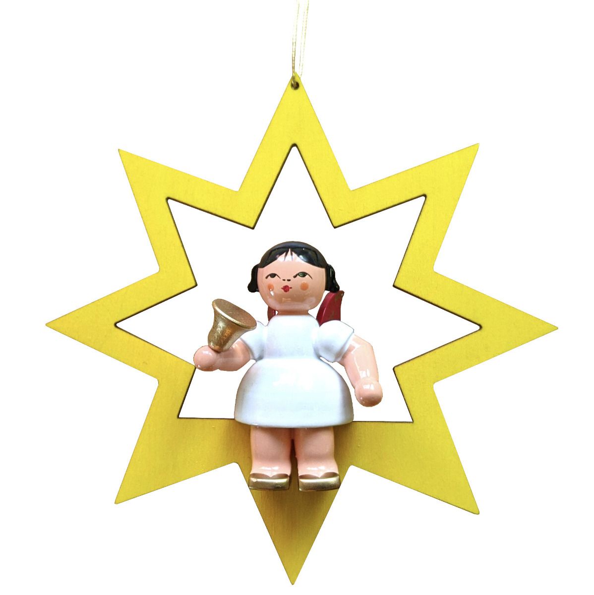 Durchmesser 105 mm, mit Engel aus der Serie "Uhlig Engel" sitzend, Höhe 50 mm, Neuheit 2021, Original erzgebirgische Handarbeit, vor Feuchtigkeit schützen, nur im Innenbereich verwenden.
