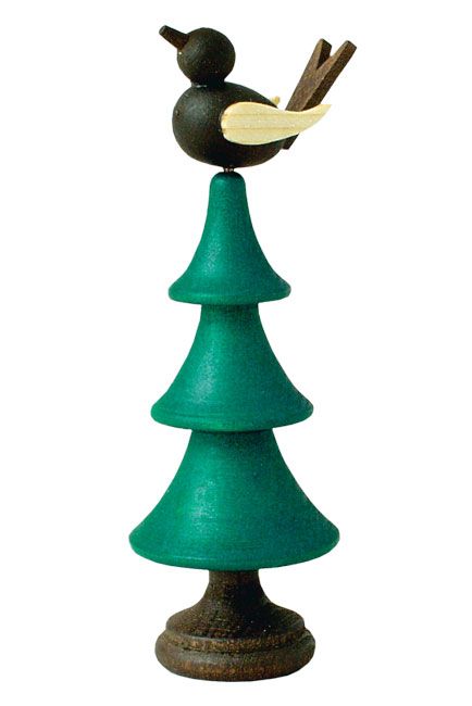 Höhe ca. 8,0 cm, aus heimischer Buche, lackiert mit unbedenklichen zertifizierten Farben, geeignet für Kinder ab 3 Jahren, Beim Drehen des Sockels bewegt sich der auf der Tanne sitzende Vogel und ein Zwitschern ist zu hören., original erzgebirgische Handarbeit, vor Feuchtigkeit schützen, nur im Innenbereich verwenden.